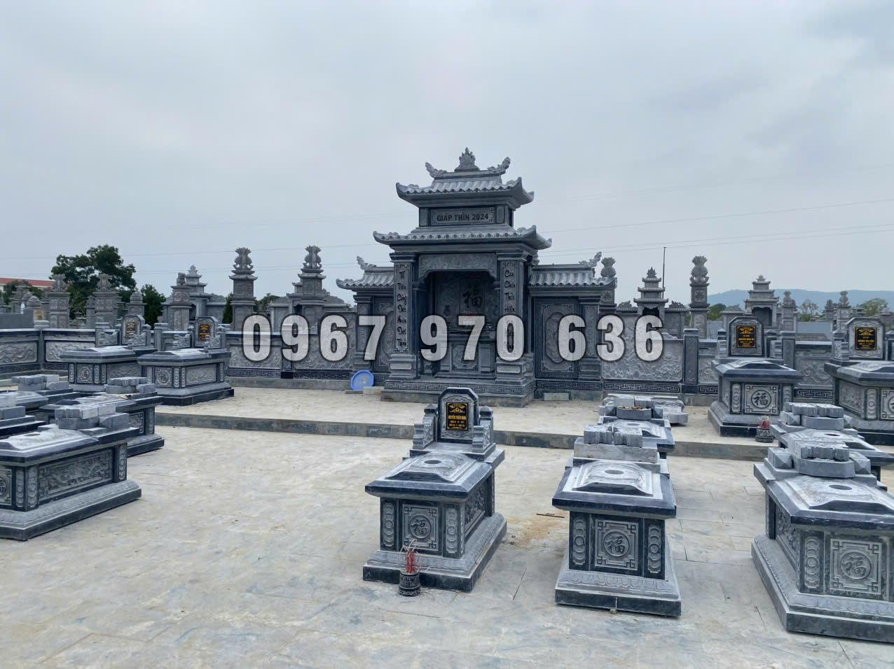 khu lăng mộ được làm bằng đá Xanh Đen Thanh Hóa. Có diện tích rất lớn thiết kế nổi bật từ cái nhìn đầu tiên với lầu thờ 4 cột có cánh hông có sự hài hòa với khuôn viên lăng mộ, tiếp theo đó là các ngôi mộ nối tiếp nhau giúp khuôn viên trở đẹp hơn…
